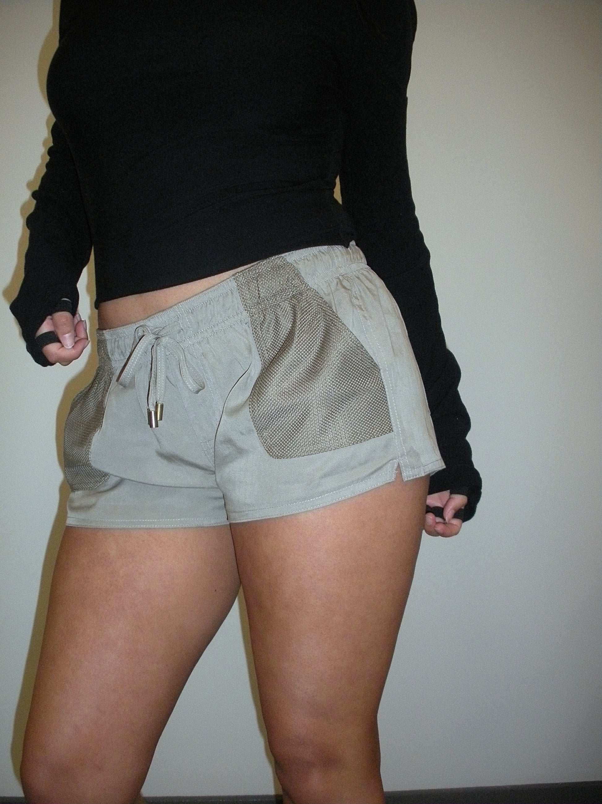 Features buttery soft tencel/lyocell material shorts with a military-tan color. Olive green fishnet detailing on pockets with tencel/lyocell lining underneath.